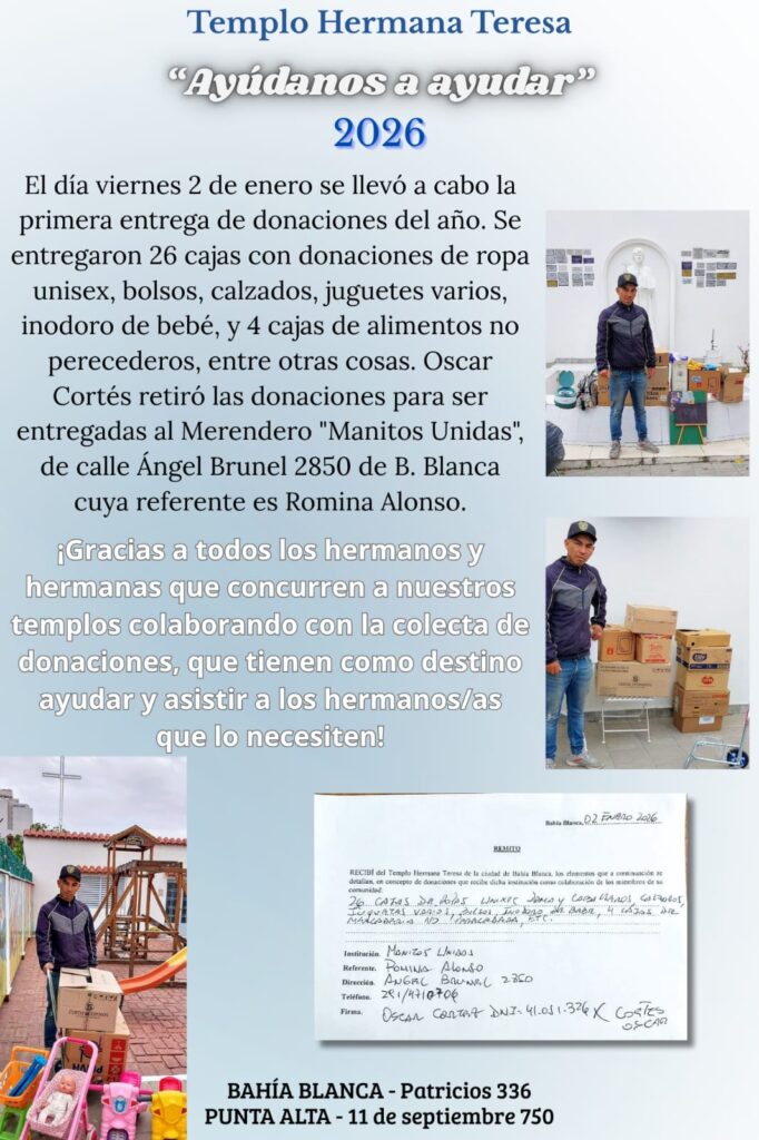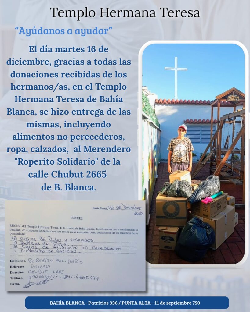 Las donaciones son destinadas tanto a merenderos de Bahía Blanca como de Punta Alta, localidades donde se encuentran tus Templos, porque Teresa dice “los Templos son de todos y no son de nadie” colaborá, porque como verás también son tuyos, porque son de Dios.