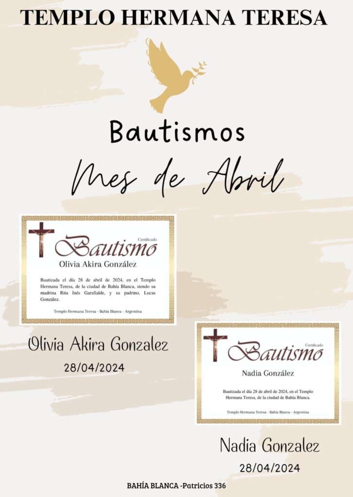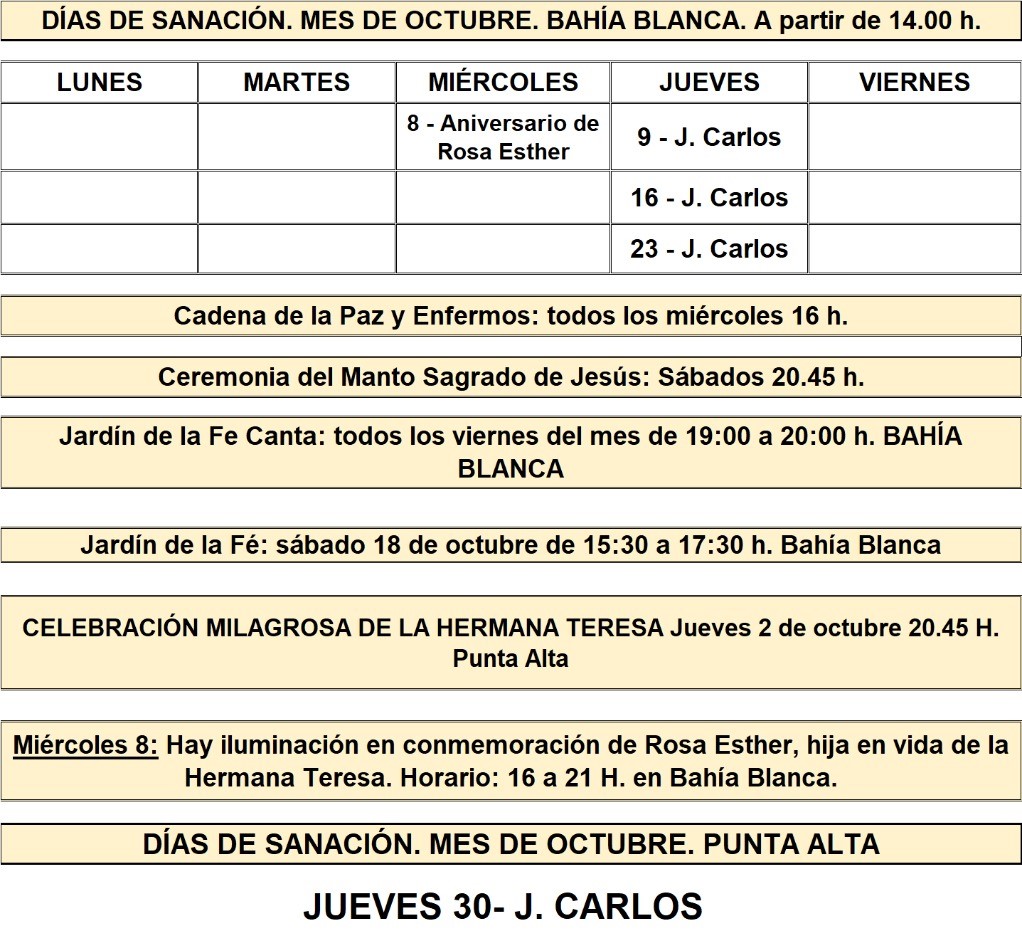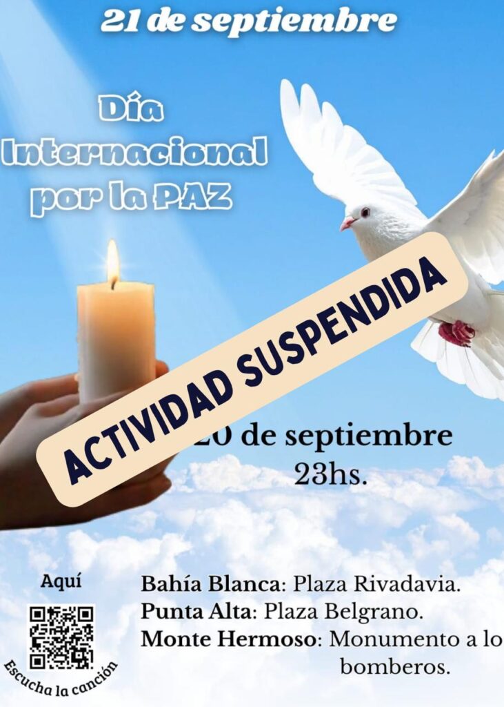 Buen día hermanos/as! quedan SUSPENDIDAS todas las actividades de nuestros Templos , como así también , la convocatoria por el Día de la Paz en Plaza Rivadavia, en Bahía Blanca, como así también en Punta Alta y Monte Hermoso. Si bien el 21 de septiembre, está decretado por Naciones Unidas , como día “Internacional de la paz”, al suspenderse por cuestiones climáticas, anunciaremos qué día, realizaremos dicho evento. La paz, si bien tiene un día decretado, la paz !! no es un día determinado, debería ser cada día de nuestras vidas!